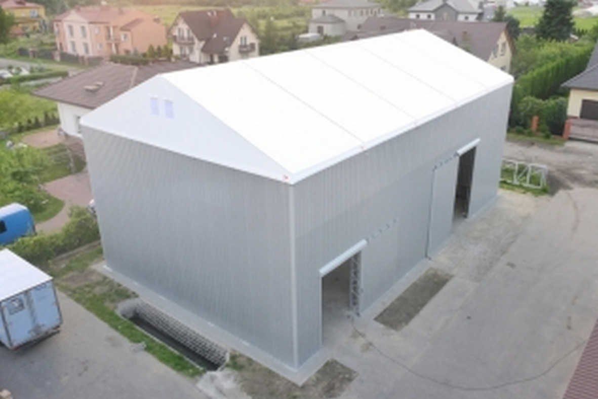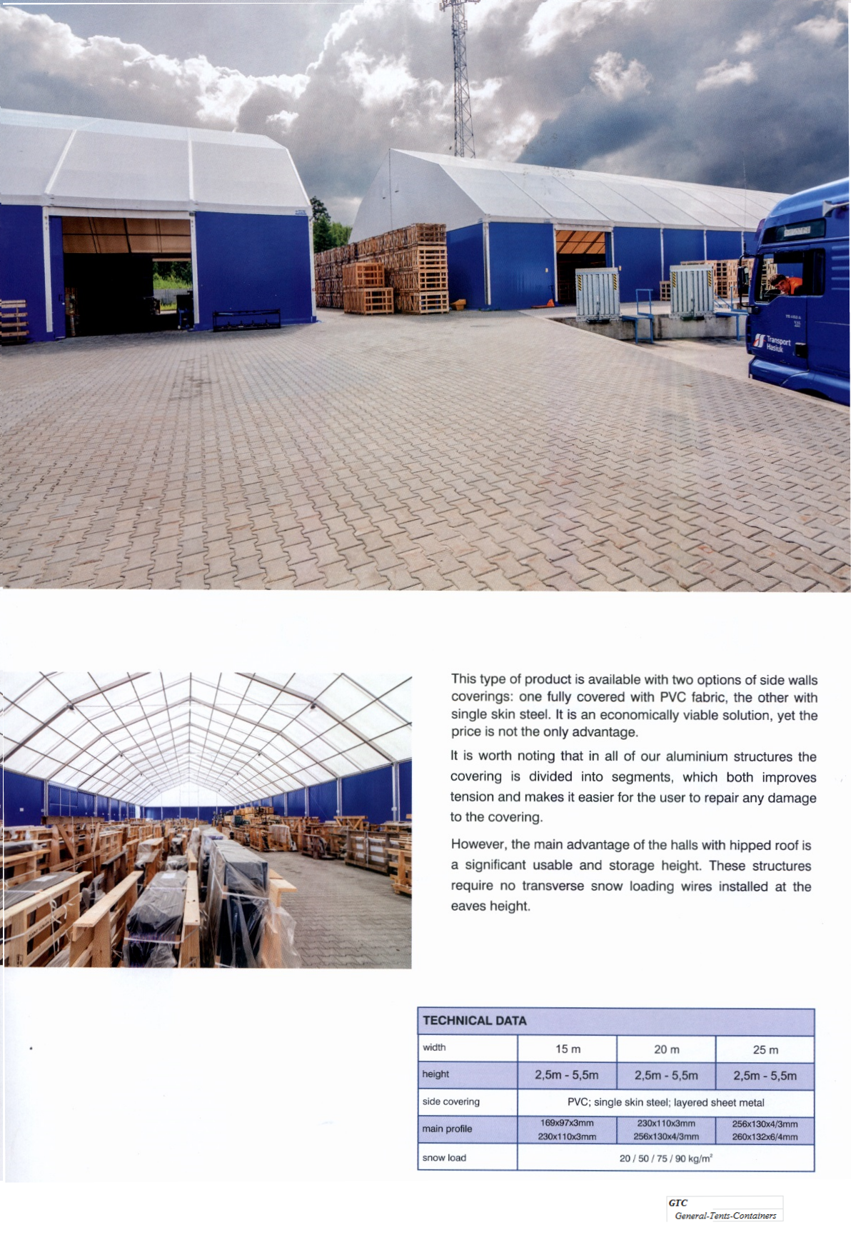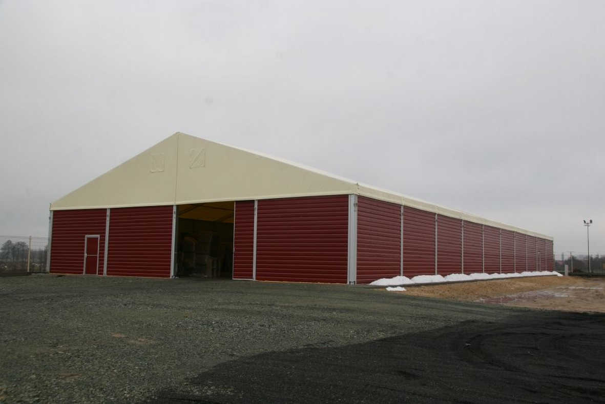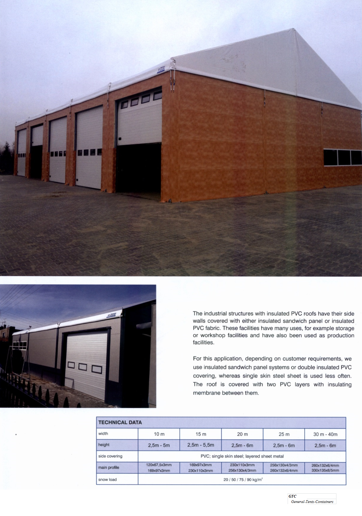 3 - 40 meters (free width) unlimited 2.6 - 5 meters side height (special: up to 10 meter) 18 or 22 ° open - pvc - single steelplate - sandwich panels (40 /80mm) UPVC single /double insulation single pvc - double pvc (dropfree) - insulated double pvc+foam UPVC single/double insulation ; Solar-Panels normal door(s),sliding gates(s),rolling door(s) none (grass) - concrete